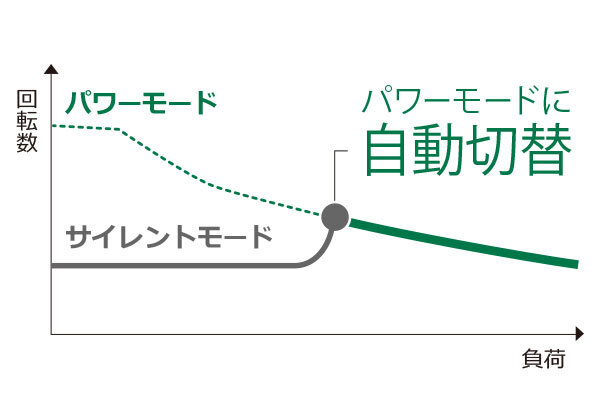 回転数を抑えることで騒音を低減するサイレントモード付。さらに、モーター負荷が大きくなると通常のパワーモードに自動切替。切断状況に応じてスムーズな切断が可能です。