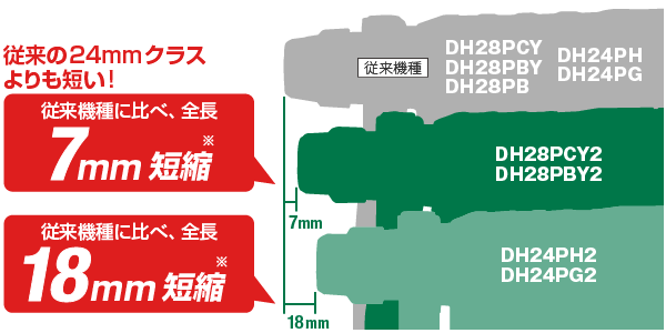 従来機種(DH28PCY/PBY/PB、DH24PH/PG)と比べ、全長がDH28PCY2/DH28PBY2は-7mm、DH24PH2/DH24PG2は-18mm短縮。DH28PCY2/DH28PBY2は28mmクラスながら従来の24mmクラスよりも短い全長です。