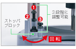 ストッパブロックを回転させることで、3段階の切込み深さが設定できます。(微調整可能)