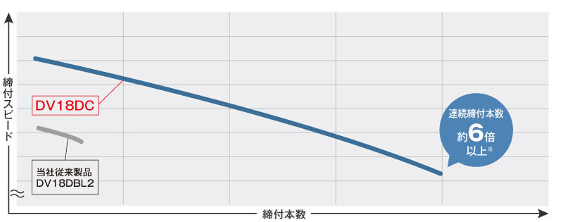 モータ仕様の最適化とインバータ回路の強化を図り、締付が困難だった構造用ビスも従来機種に比べ、6倍以上の連続締付が可能となりました。