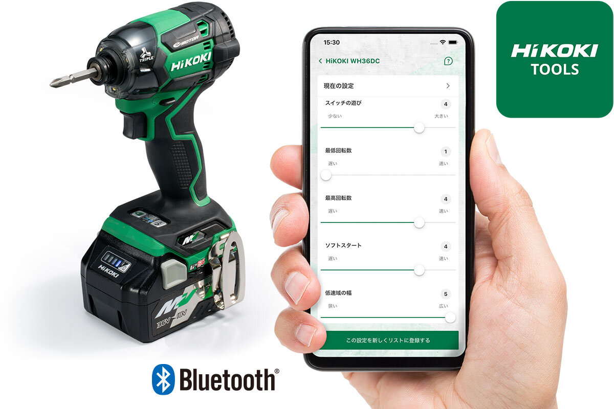 別売のBluetooth蓄電池、HiKOKI TOOLSアプリのダウンロードが必要です。