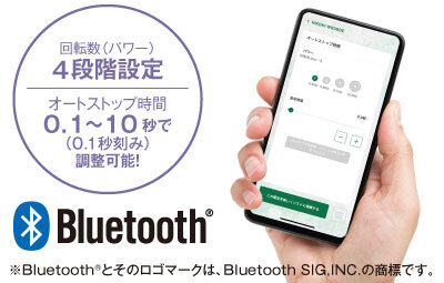 スマートフォンにアプリをダウンロードしてBluetooth蓄電池を取り付けると専用アプリから締付モードの回転数(パワー)とオートストップ時間を調整可能です。