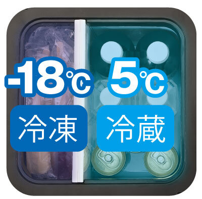 付属の仕切板で庫内を2部屋にセパレートできます。また、左右で異なる温度を設定できるためさまざまな使い方ができます。最大設定温度差は30℃です。